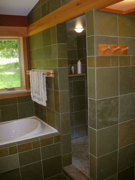 Crocker Residence Grant, MN 55082 Kota Brown limestone shower & Trajet tub.